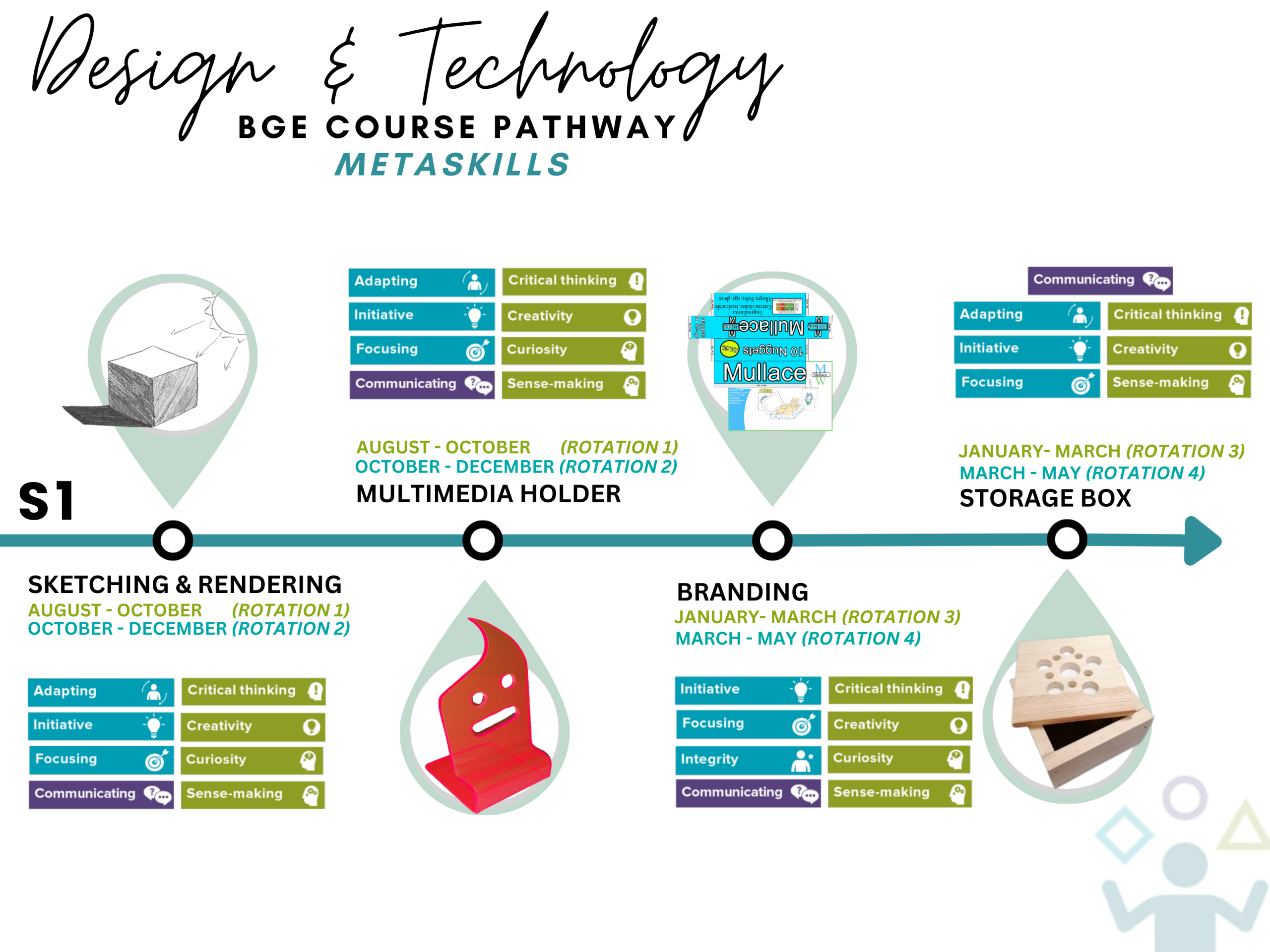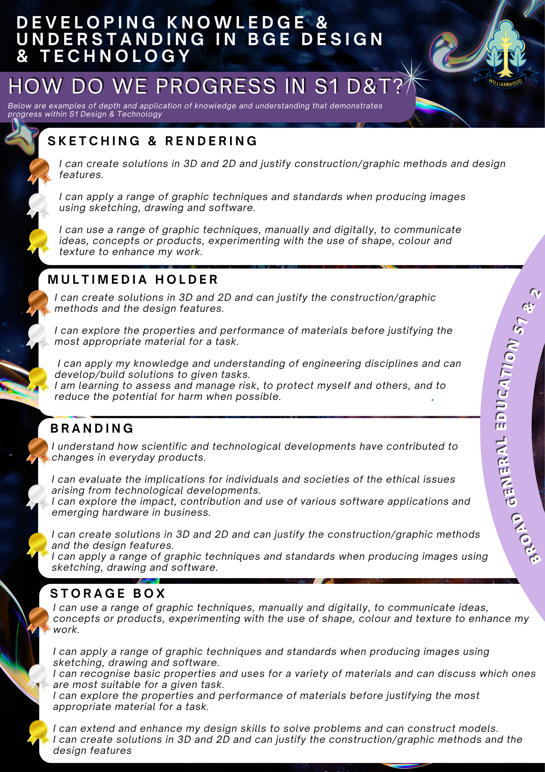 The Design and Technology course for S1 & S2 pupils covers a range of innovative topics, over 4 rotations, where pupils are challenged to develop their knowledge and understanding of design and their creativity and problem solving skills.