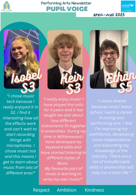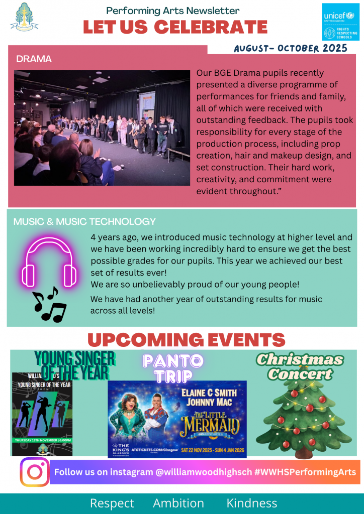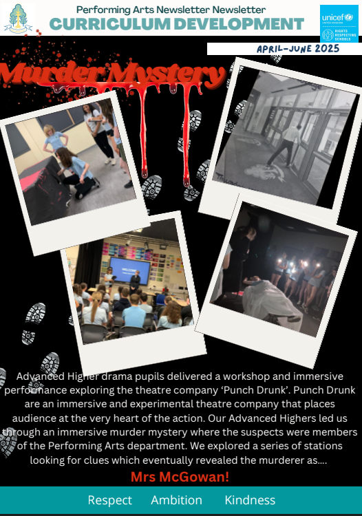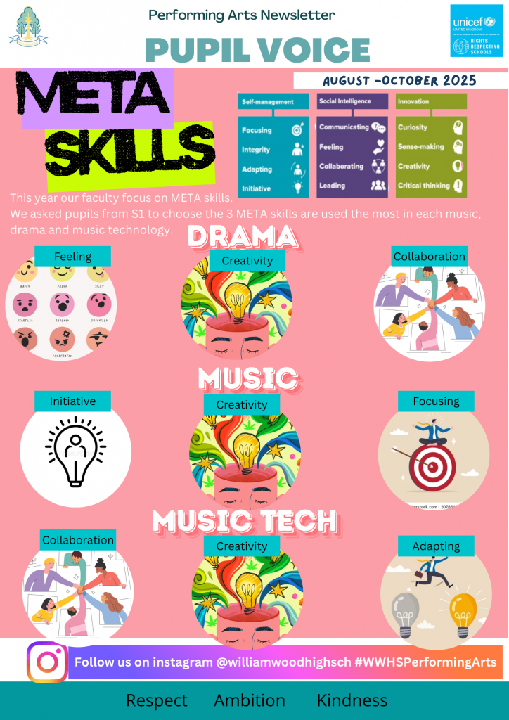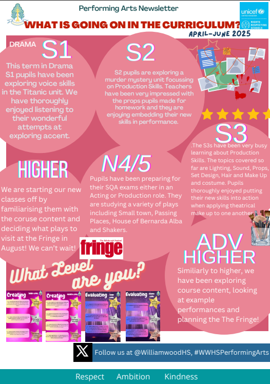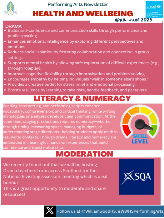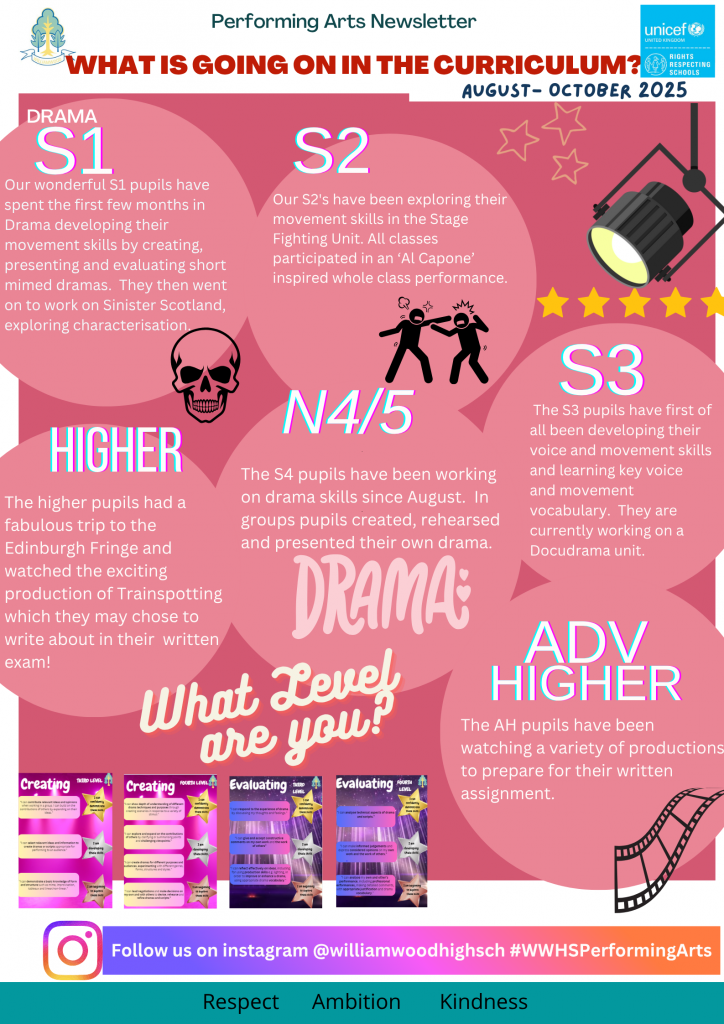 Literacy – Learners discuss theatre and write performance analyse essays. Pupils utilise communication skills to creatively develop group performances, by reading, researching and analysing plays pupils document design ideas in a portfolio.