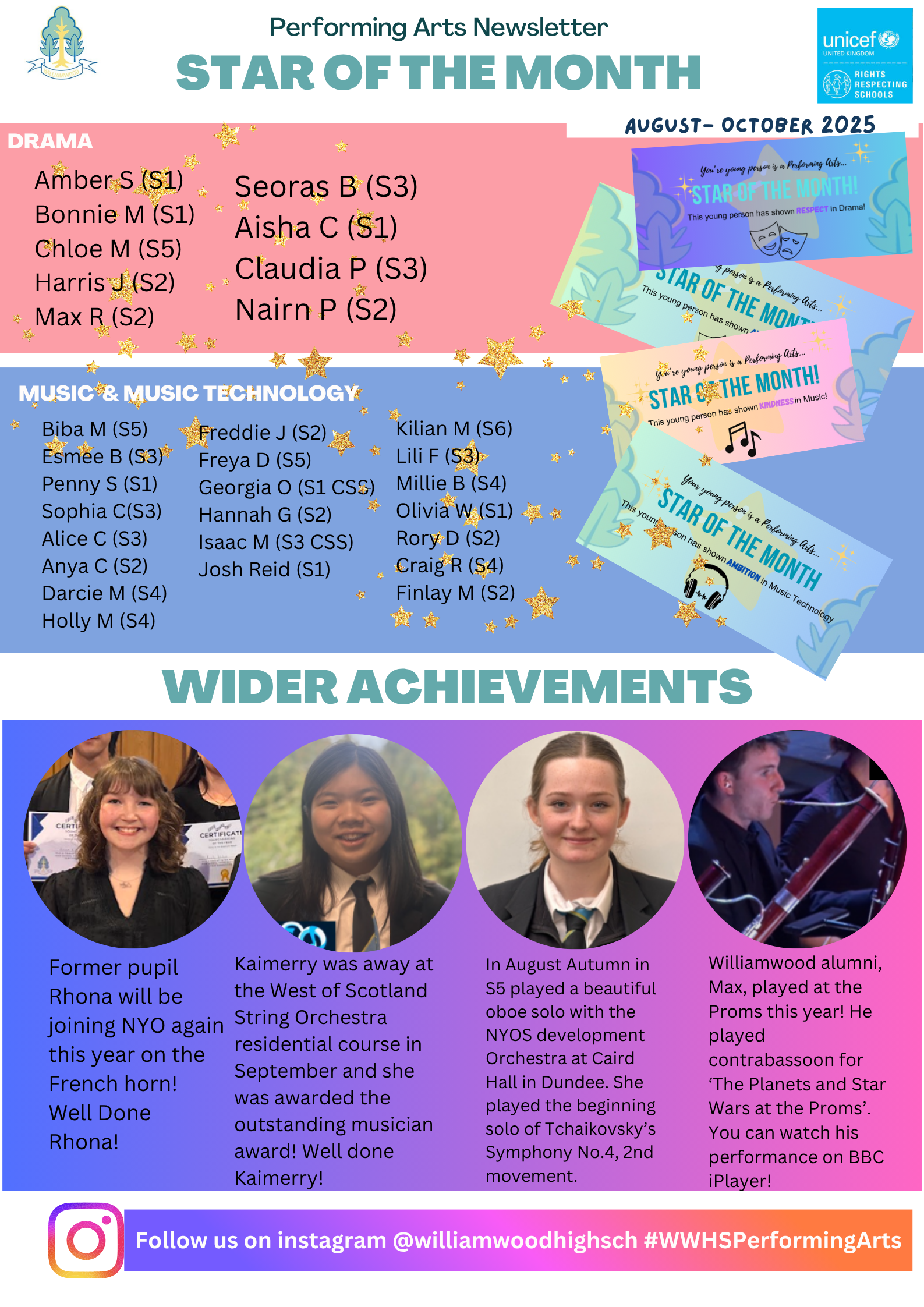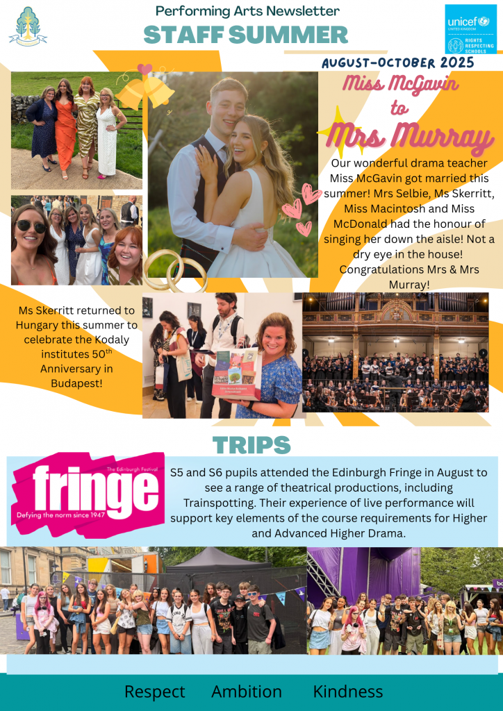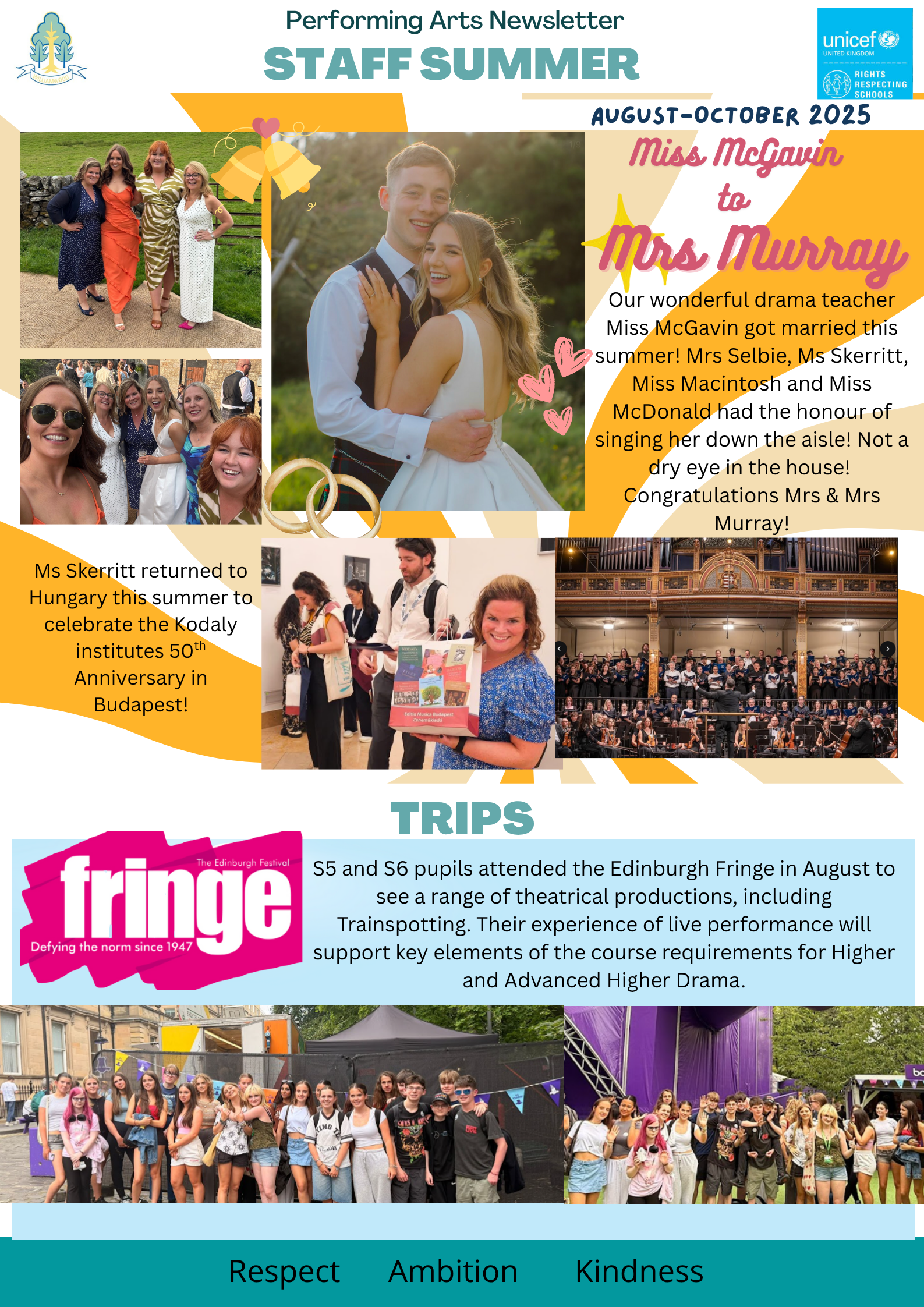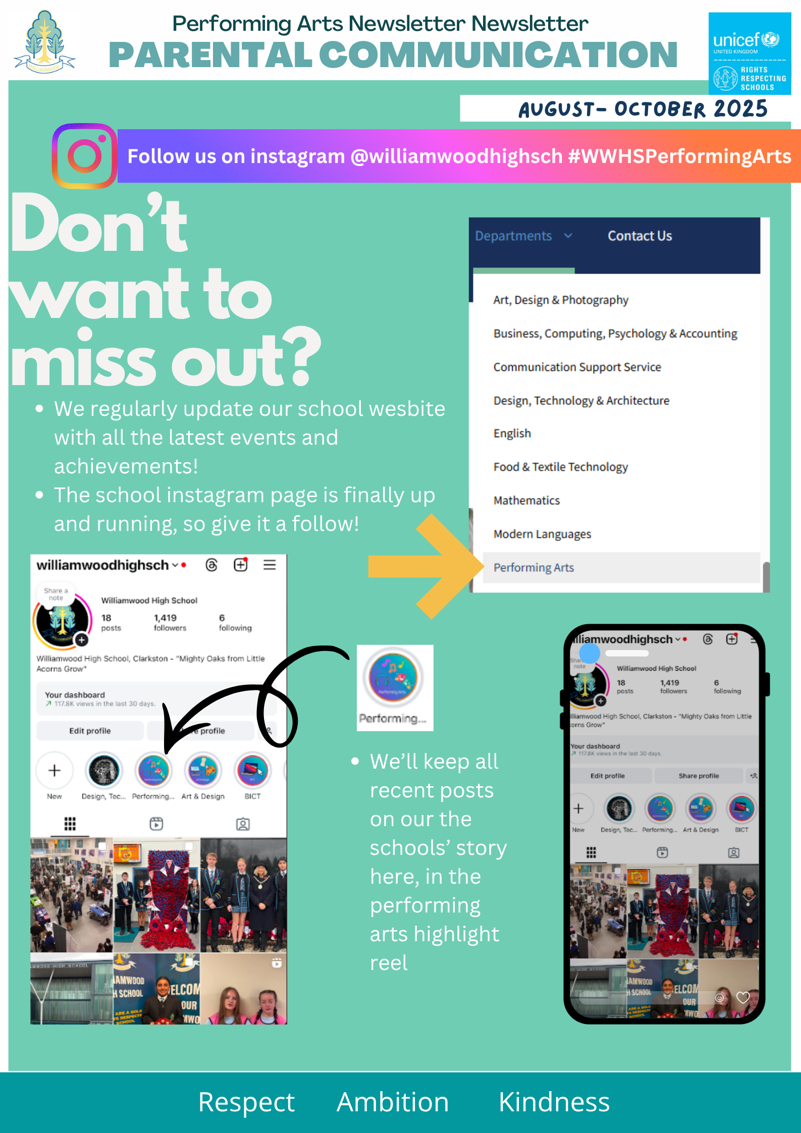 Inter-disciplinary Connections – To promote Health & Wellbeing we discuss social, political and historical Issues and look for opportunities to link with relevant departments. School shows gives pupils’ access to whole school involvement in backstage, design, production & marketing roles